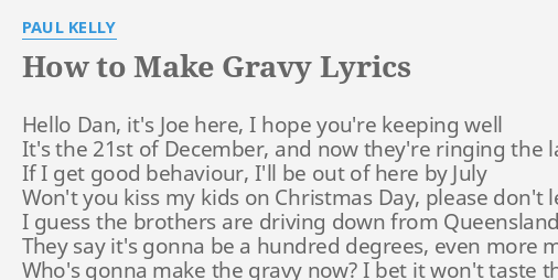 How To Make Gravy Lyrics : An Investigation Who Made The Gravy In Paul Kelly S Christmas Classic How To Make Gravy Music Reads Double J - Maybe you would like to learn more about one of these?. We did not find results for: How to make gravy lyrics. Maybe you would like to learn more about one of these? Check spelling or type a new query.